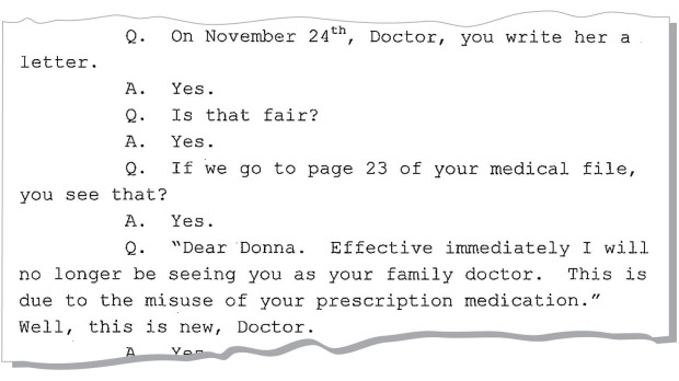 It was then he sent Ms. Bertrand a note. “Dear Donna,” Dr. Redekopp wrote on Nov. 24, 2008. “Effective immediately, I will no longer be seeing you as your family doctor. This is due to the misuse of your prescription medication.”