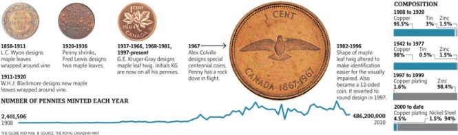 The Mint makes coins based on annual need. It produced 486 million new pennies in 2010, compared with 24 million loonies and 62 million quarters. It costs $11-million to manufacture and distribute about $6.9-million worth of pennies – hardly good bang for the buck, in Finance Minister Jim Flaherty’s view.