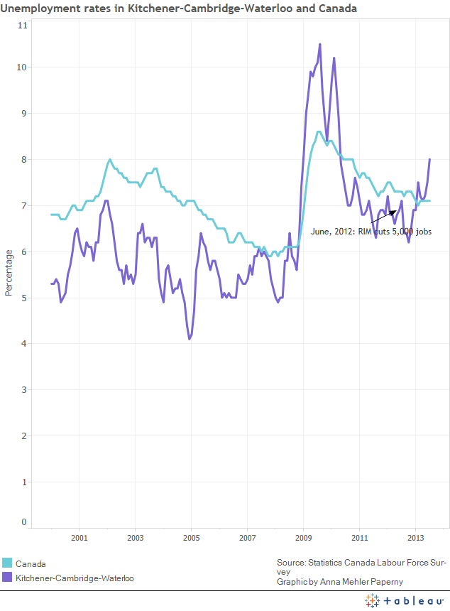 How closely tied are Waterloo’s fortunes to Blackberry’s? The interactives below chart a decade of unemployment rates, and map a 10 years of change in median family incomes in the Kitchener-Waterloo area: